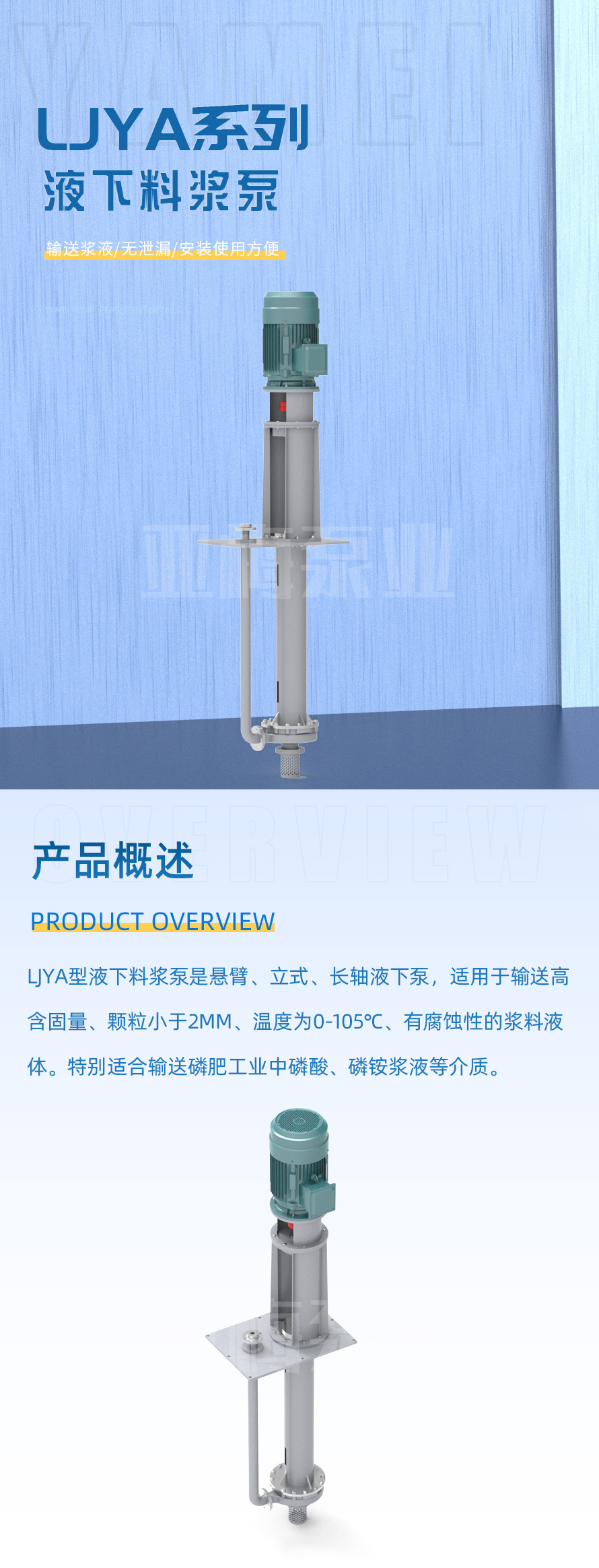 LJYA型懸臂立式液下料漿泵是我公司結(jié)合國內(nèi)外同類先進產(chǎn)品研制而成,適用于輸送含固量在35%以下、顆粒小于2mm、溫度為0-105℃、有腐蝕性的漿料液體。
